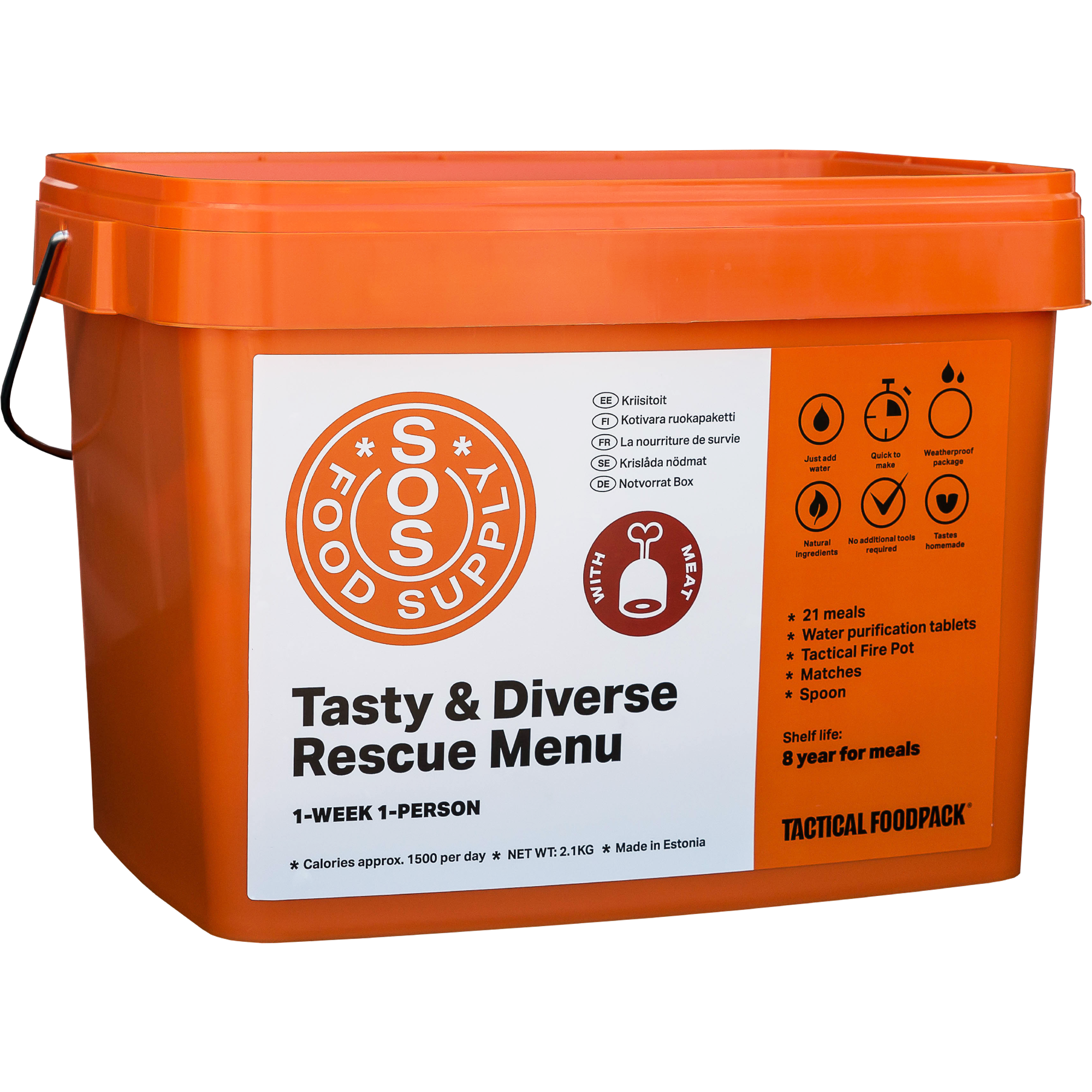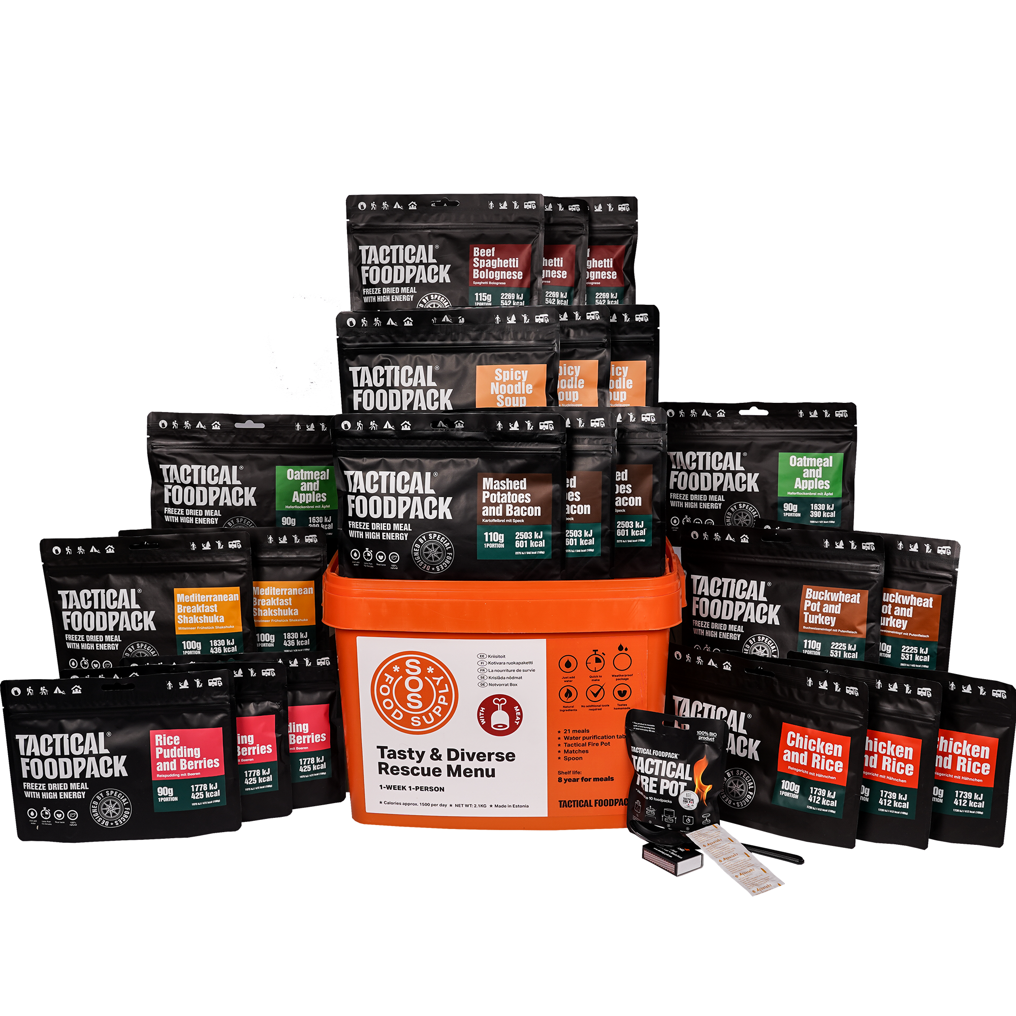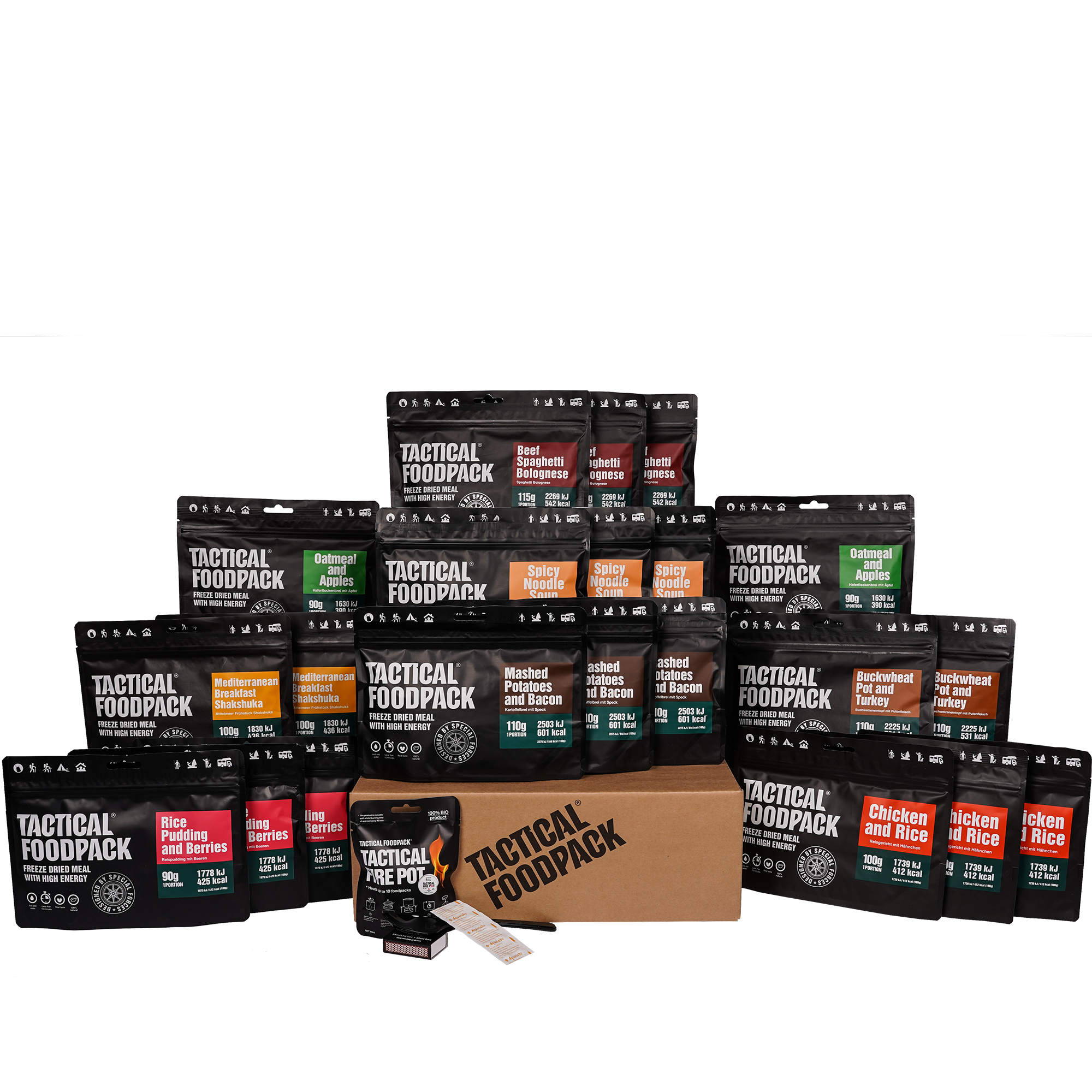 Use: Add the required amount of cold water in the food packet and stir. Open the cover of the Tactical Fire Pot, place the Pot on a heat-resistant surface, and light the gel firestarter with a match or lighter. Fold the Tactical Foodpack’s bottom flat and place it above the Pot, making an elevation for the packet (two mugs, two stones etc. that are taller than the Tactical Fire Pot). Keep the food packet above the Pot until the content starts to boil, then remove the food packet from the flame, close the grip, and leave the meal to stand for the time duration indicated on the packet. To extinguish the gel firestarter, place a cover over the flame; do not blow on it! The product is reusable, total burning time is 40 min.