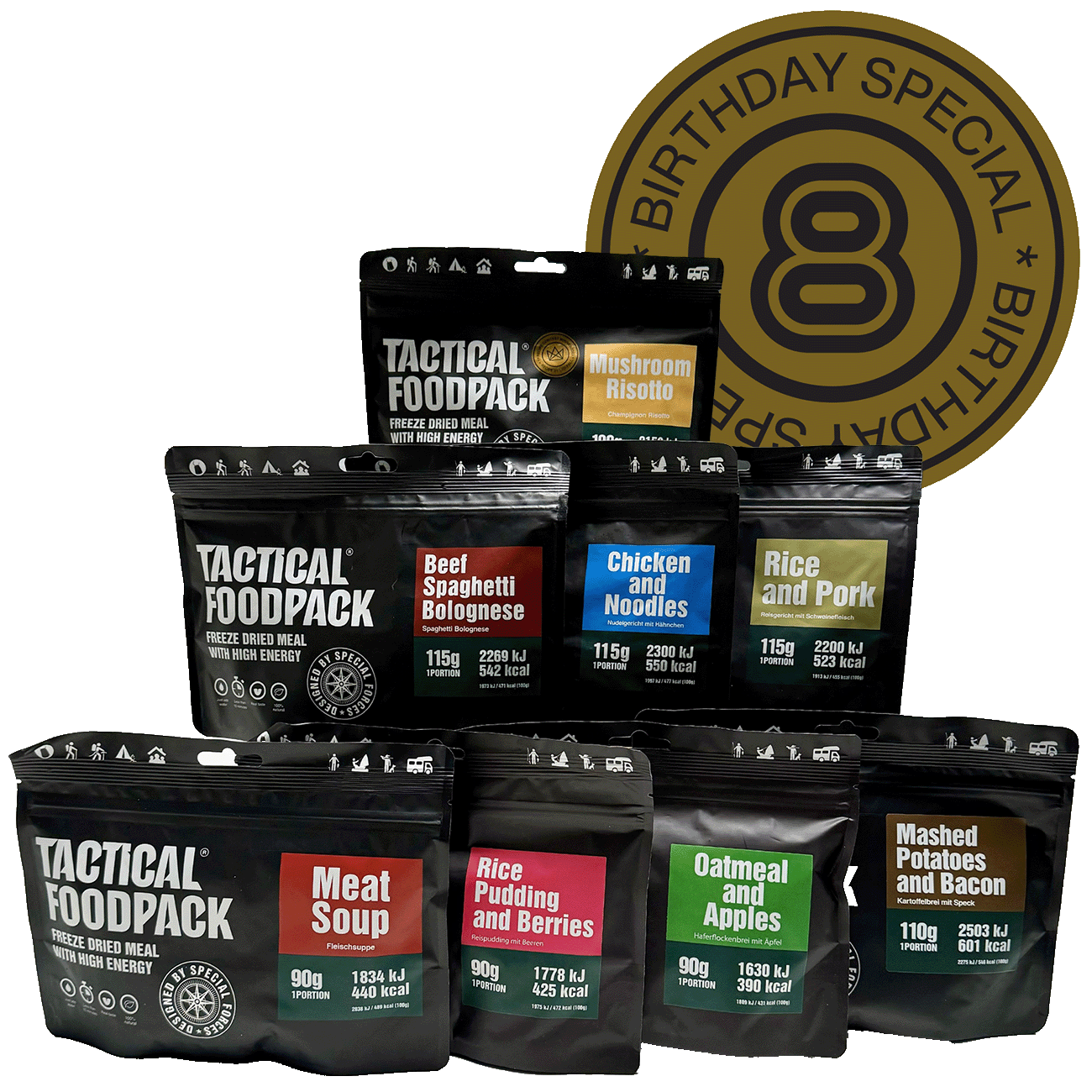 Celebrate with us and discover the first 7 original Tactical Foodpack meals that are still running strong today as many of them have become best-sellers. Since birthday would not be special without gifts, you will also find a new exclusive meal inside this special edition box for free. Creamy and insanely delicious Mushroom Risotto won the Recipe Contest and you can get your hands on it before it officially launches in our e-shop.