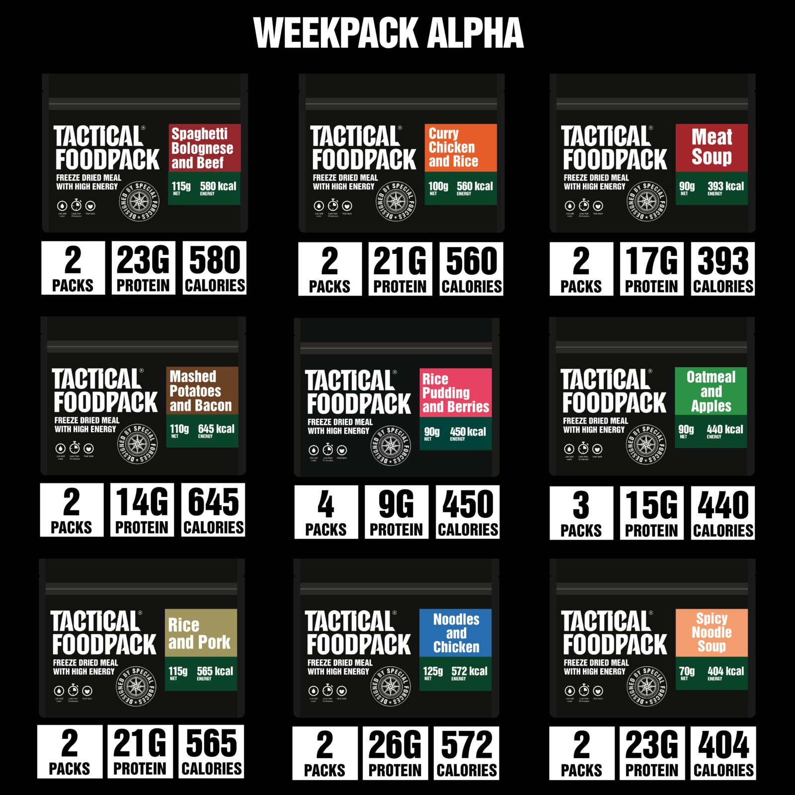 - 2x Spaghetti Bolognese and Beef – Net wt 115g, 580 kcal, 1 pouch = 1 serving = 420g (after added water)